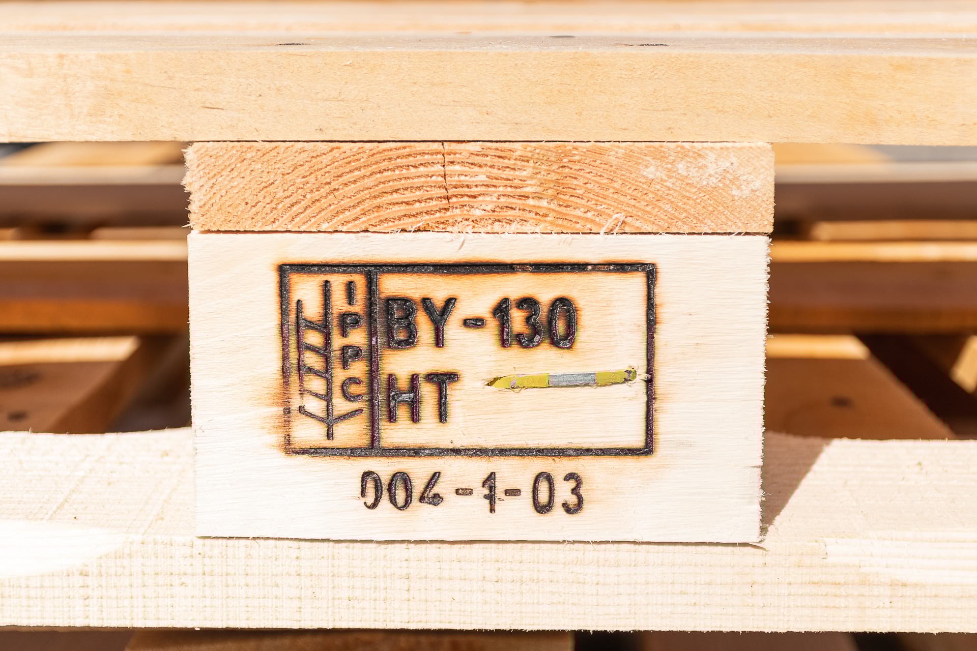 На специальной линии поддоны проходят маркировку: на боковые блоки ставятся штампы EPAL, на центральный блок – штамп IPPC, код страны, регистрационный номер национального органа по защите растений, тип обработки (термообработка/HT), номер лицензии-год-месяц. После визуального осмотра специалиста по контролю качества на готовый поддон устанавливается контрольная скоба EPAL.